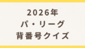 野球 【2026年】パ・リーグ背番号クイズ|6球団の選手の背番号を覚えよう プロ野球ファンにおすすめの背番号クイズです。パ・リーグ6球団(ソフトバンク・日本ハム・オリックス・楽天・西武・ロッテ)の選手の背番号を覚えてみましょう。レベル別に4択で出題します。 2026.04.18 野球