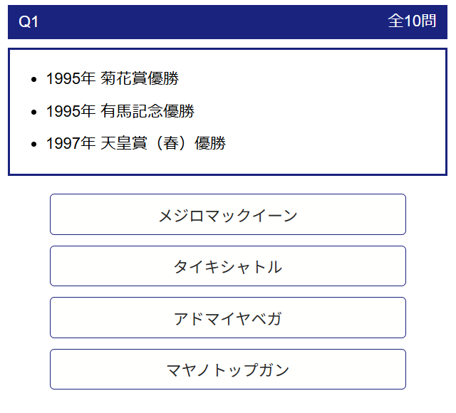 3つのヒントが指し示す馬の名前を4つの選択肢から選びましょう。