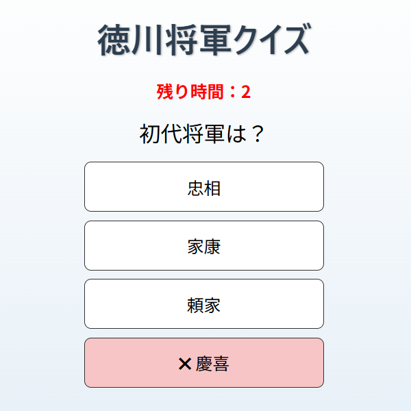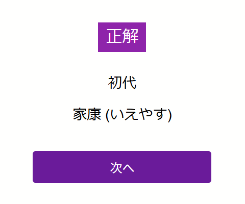 - 次へボタンを押すと二代目将軍を答える画面が表示されます。