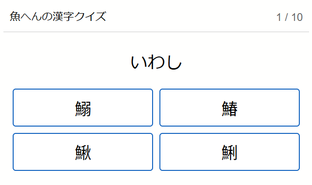 ひらがなで書かれた生き物の漢字を4個の選択肢から選びましょう。