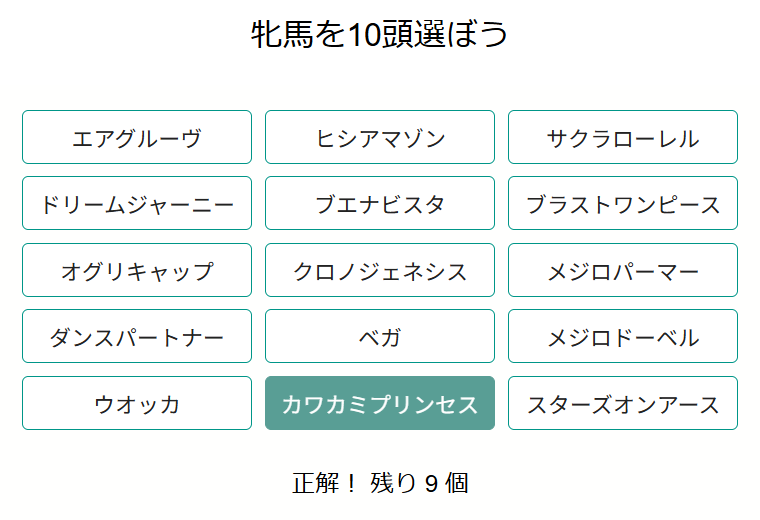 15個の選択肢の中から、牝馬を10頭連続で選んでください。