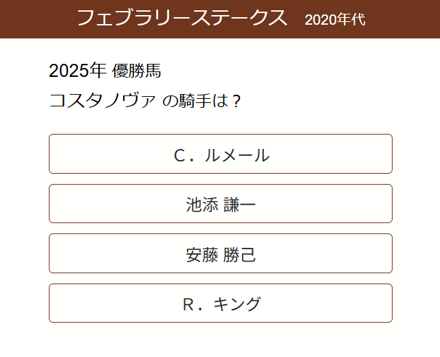 G1に昇格した1997年から2026年までの、フェブラリーステークスの勝利騎手を答える4択クイズです。