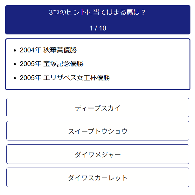 3つのヒントが指し示す馬の名前を4つの選択肢から選びましょう。