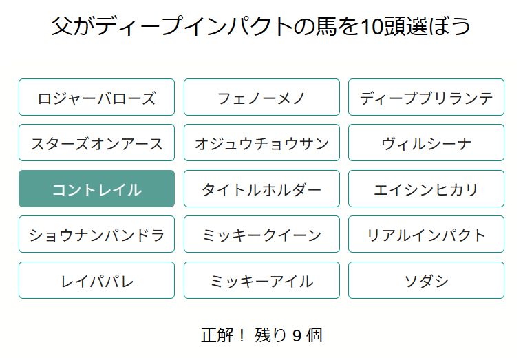 ランダムで表示される15頭のうち、ディープインパクト産駒を10頭選びます。