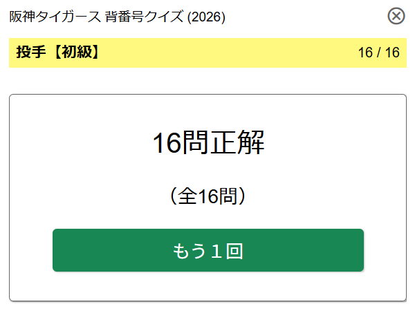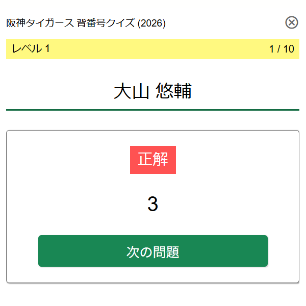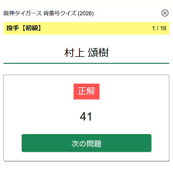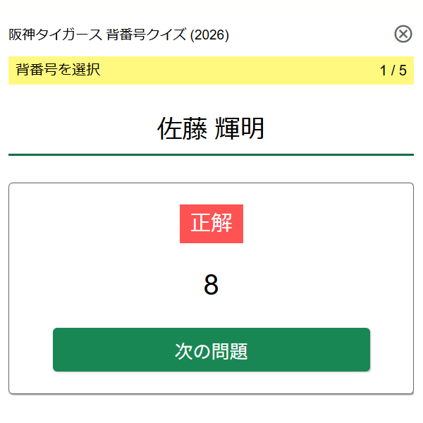 「次の問題」を押すと、違う選手の背番号を答える画面が表示されます。