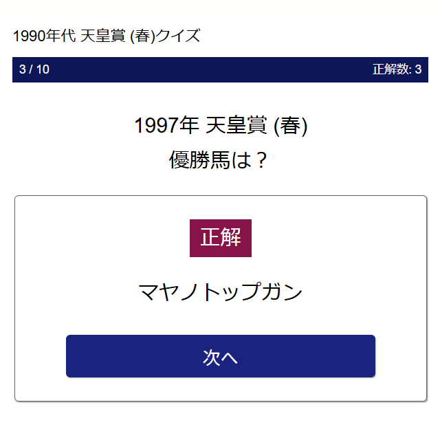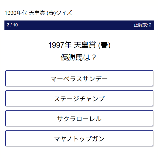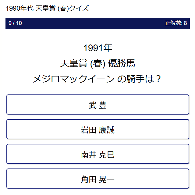 1980年から最新のレースまで、歴代の優勝馬と勝利騎手を答える4択クイズを作成しました。年代ごとに順次出題します。